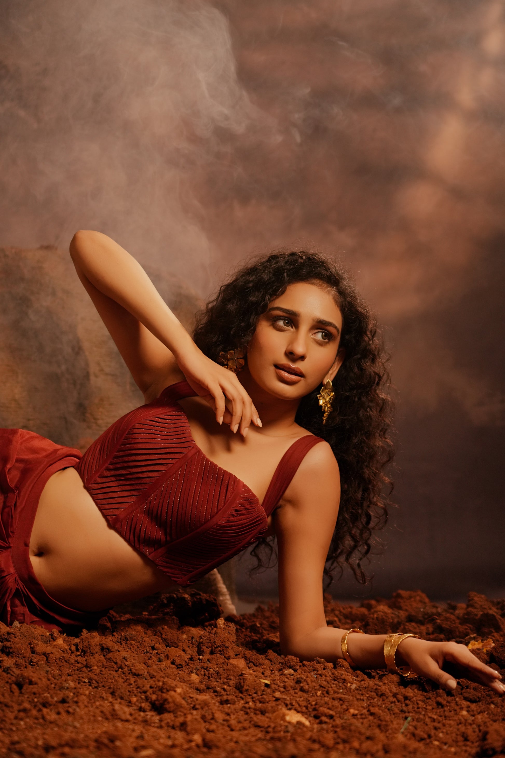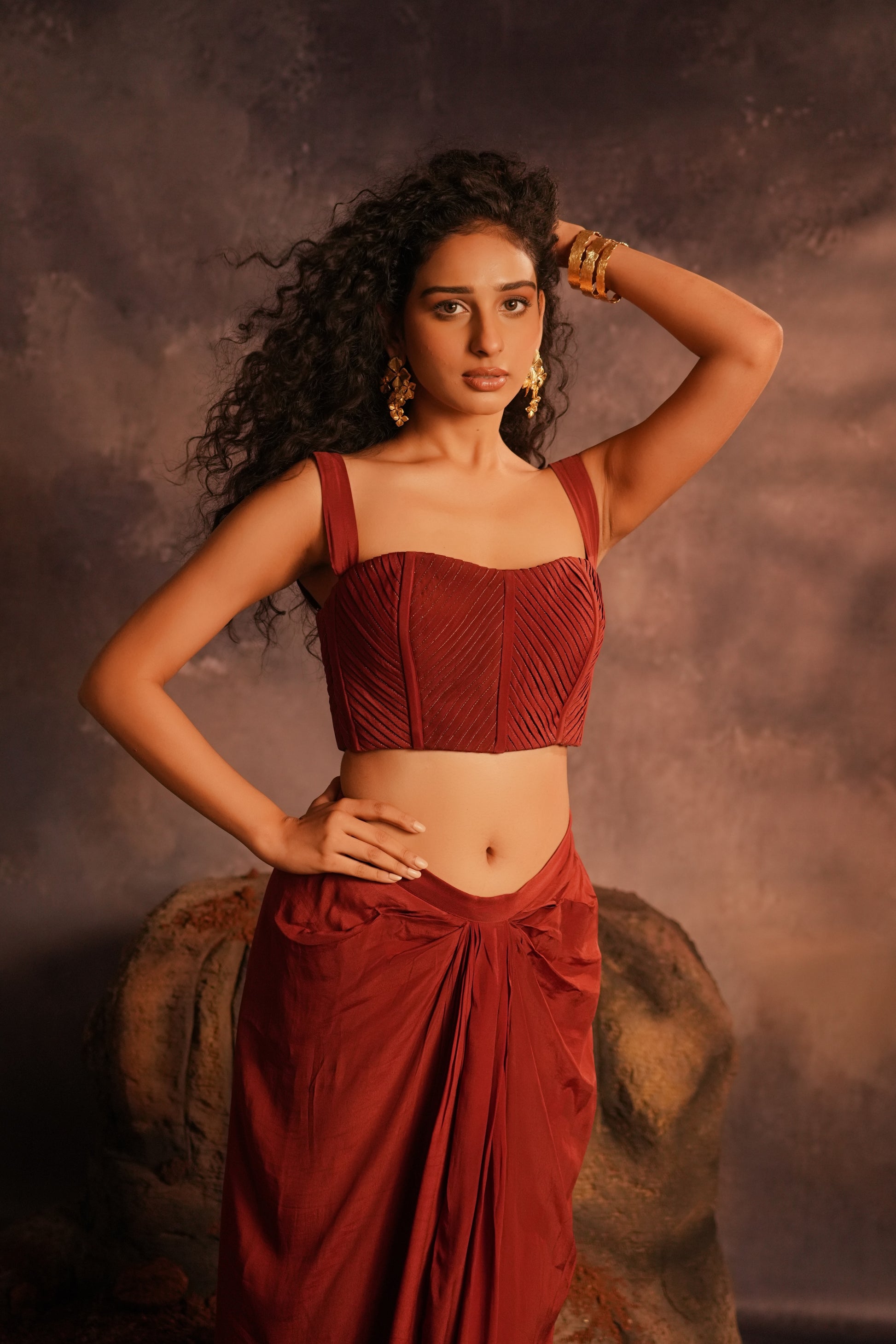 Crafted in crepe silk, this set features a deep maroon crop top finished with fine pin tuck detailing that adds subtle structure. It’s paired with a maroon draped skirt that falls neatly and shapes the silhouette in a flattering way. Perfect for evenings that call for glamour.