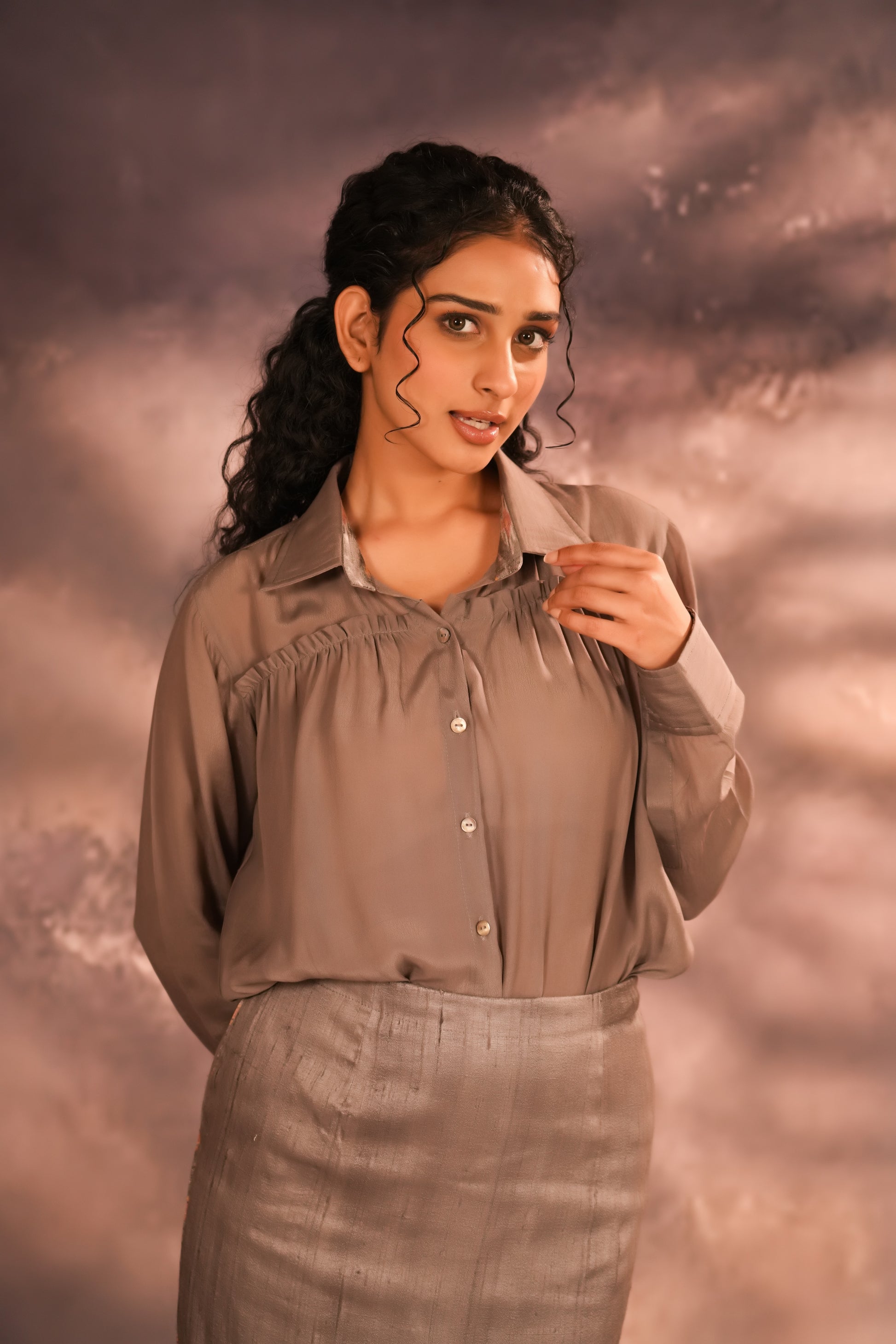 This grey set blends raw silk, crepe silk, and ikkat silk to create a textured and layered look. The collared shirt-style blouse brings a structured touch, while the long skirt features an ikkat border that adds a modern twist.